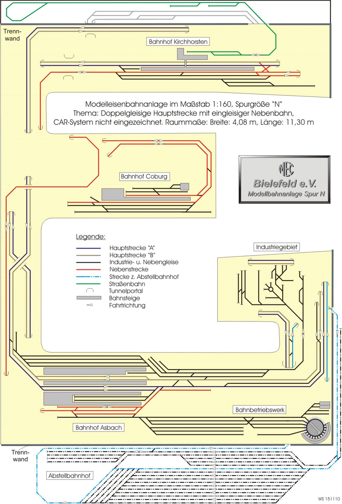 Auf der Anlage wurden ca. 225 m flexible Gleise unterschiedlicher Fabrikate verlegt. Dabei sind etwa 100 m Gleislänge dem Auge des Betrachters entzogen. Außerdem kamen 152 Weichen, davon 134 mit elektrischem Antrieb, 3 Doppelkreuzweichen und 1 Drehscheibe zum Einbau. Inzwischen ist die N-Anlage auf Digitalbetrieb umgerüstet.
