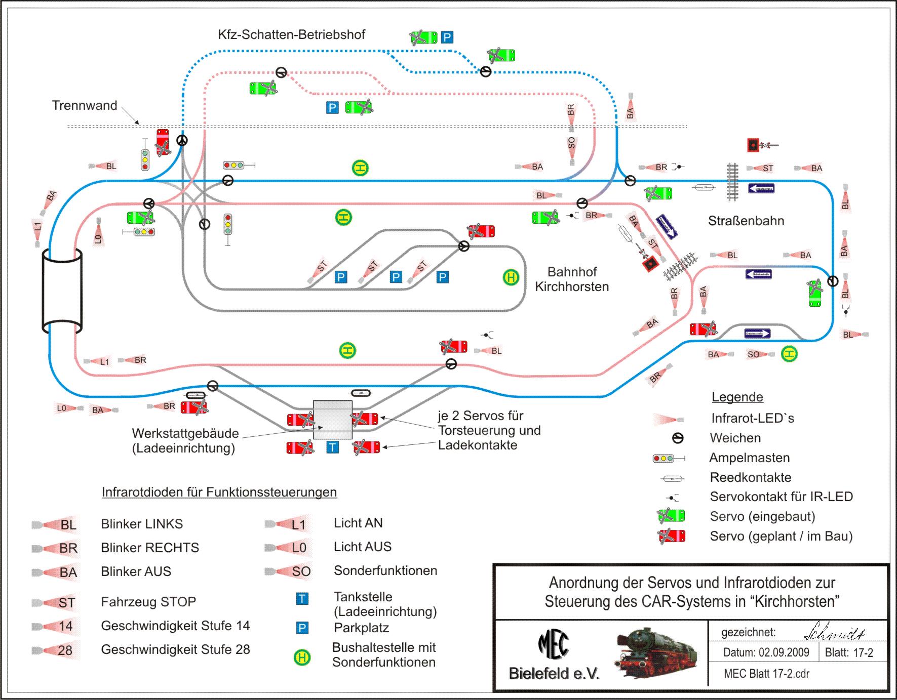 Die Steuerung eines solchen Car-Systems erfordert noch viele Baugruppen und Sensoren. Wenn man tiefer in die Materie einsteigt, merkt man erst, dass wir noch einiges an Gehirnschmalz und Kosten aufbringen müssen. Denn konfektionierte Steuerungen wie sie im Handel angeboten werden, nehmen unser Budget zu stark in Anspruch. Wenn wir einige Schritte weiter sind, geben wir gerne Tipps und Informationen weiter. Wir nehmen auch gerne Ratschläge an! Der Streckenverlauf und einige technische Daten können der separaten Schemaskizze entnommen werden.